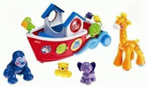 Description: The ark comes with 4 fun Amazing Animals friends including a giraffe, gorilla, elephant and bear. The animals feature fun articulated joint with clicking sounds. They can all be placed in the ark and taken for a ride. When baby rolls the ark, he`ll hear one of 5 sung songs. Baby can also activate songs, animal sounds and lights by batting at the roller drum. The ark has lots of busy activities for baby too: a clicking turtle, fish bead bar, boingy bird and a peekaboo porthole. 1 x boat 1 x giraffe 1 x gorilla 1 x elephant 1 x teddy bear| Cover image | Item type | Current library | Call number | Status | Barcode | |
